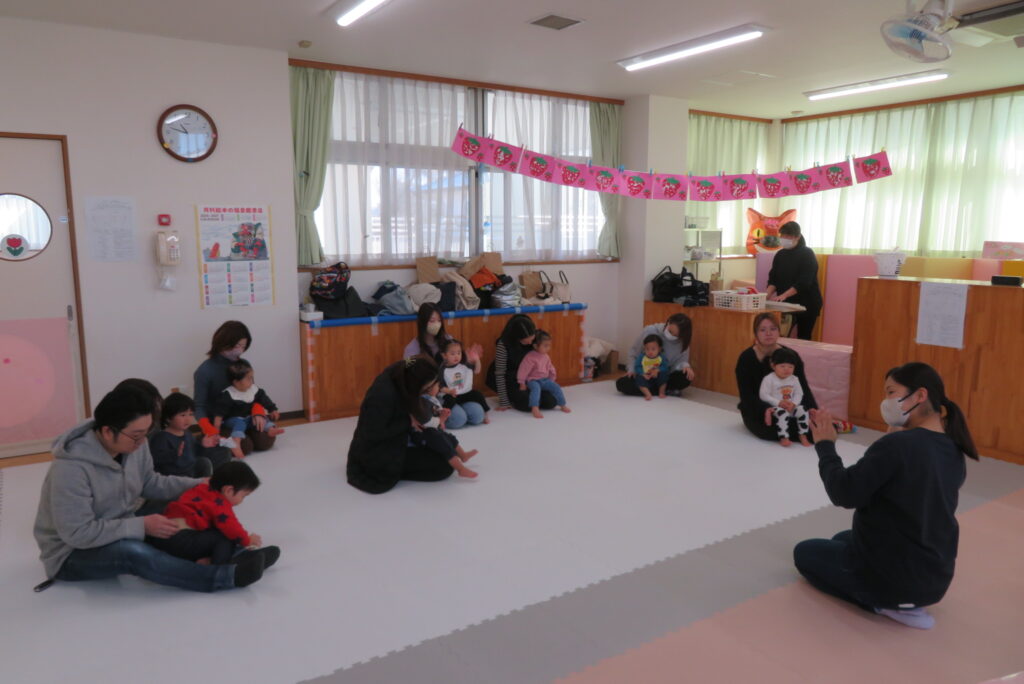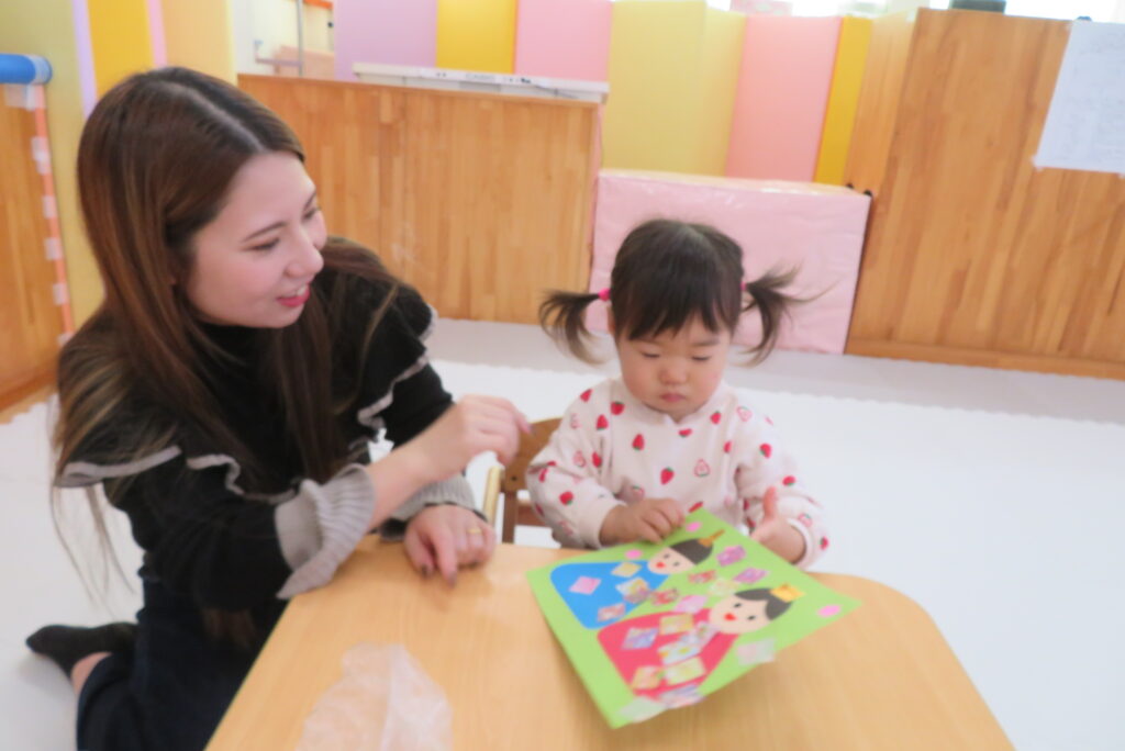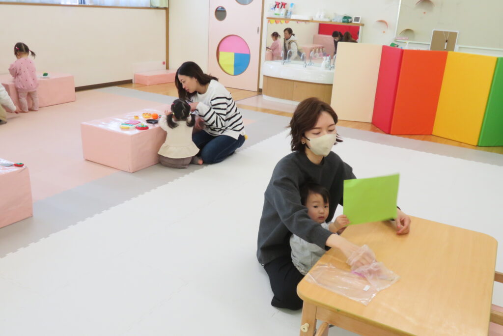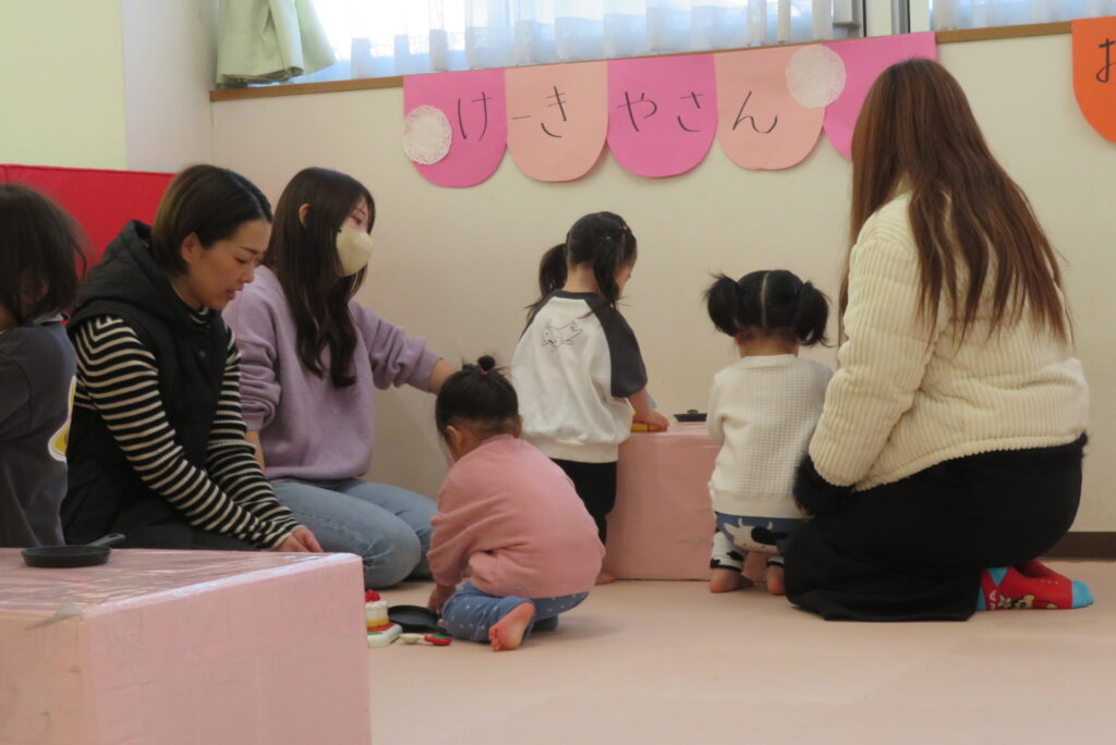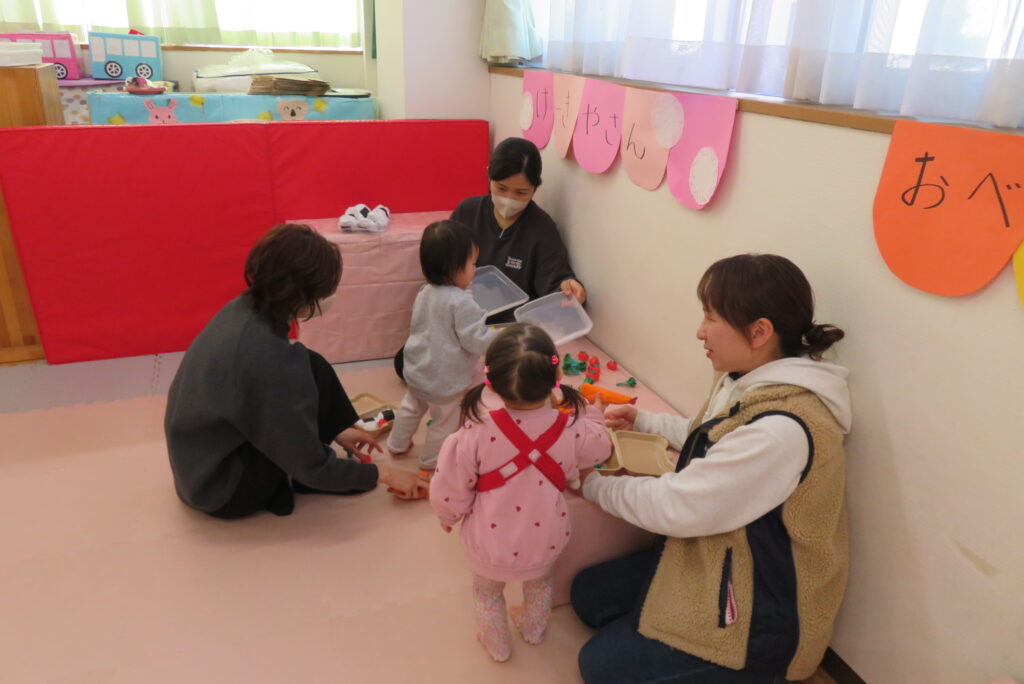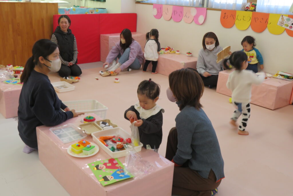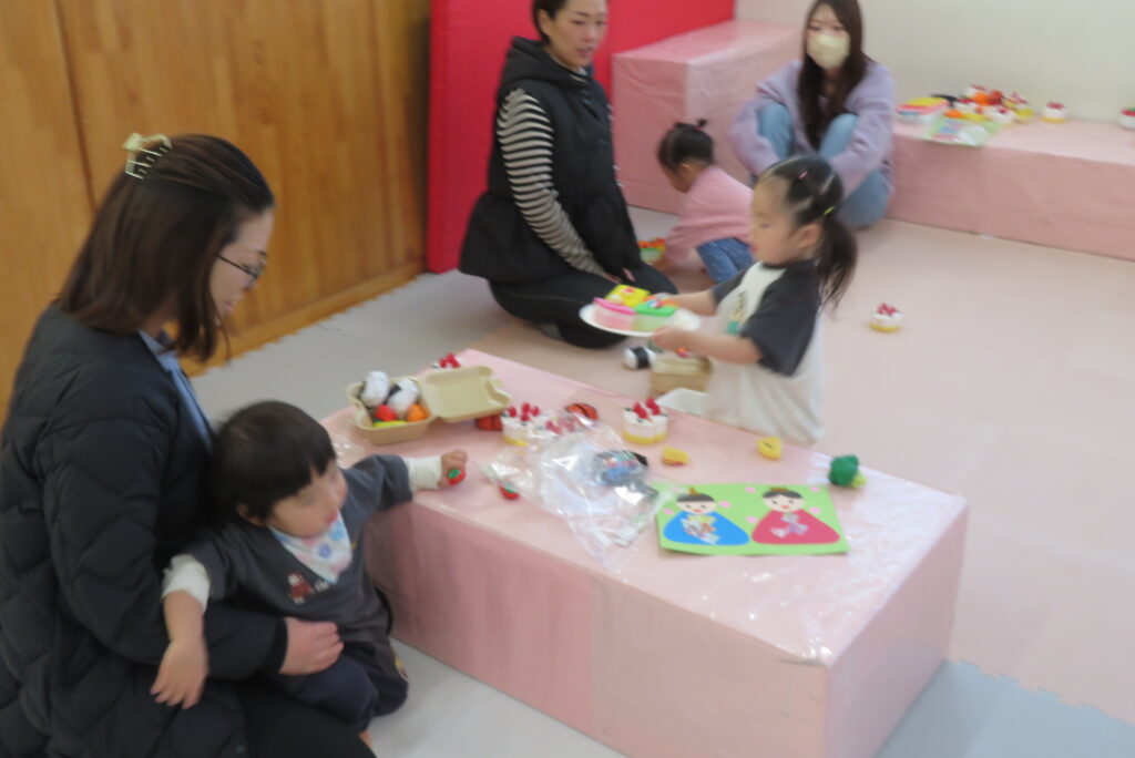 親子一緒にごっこ遊びをしたり、ひな祭り製作を行いました。
