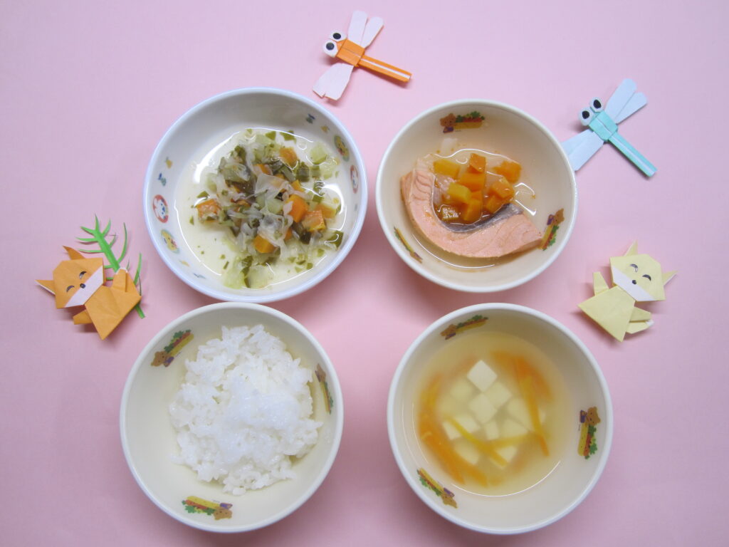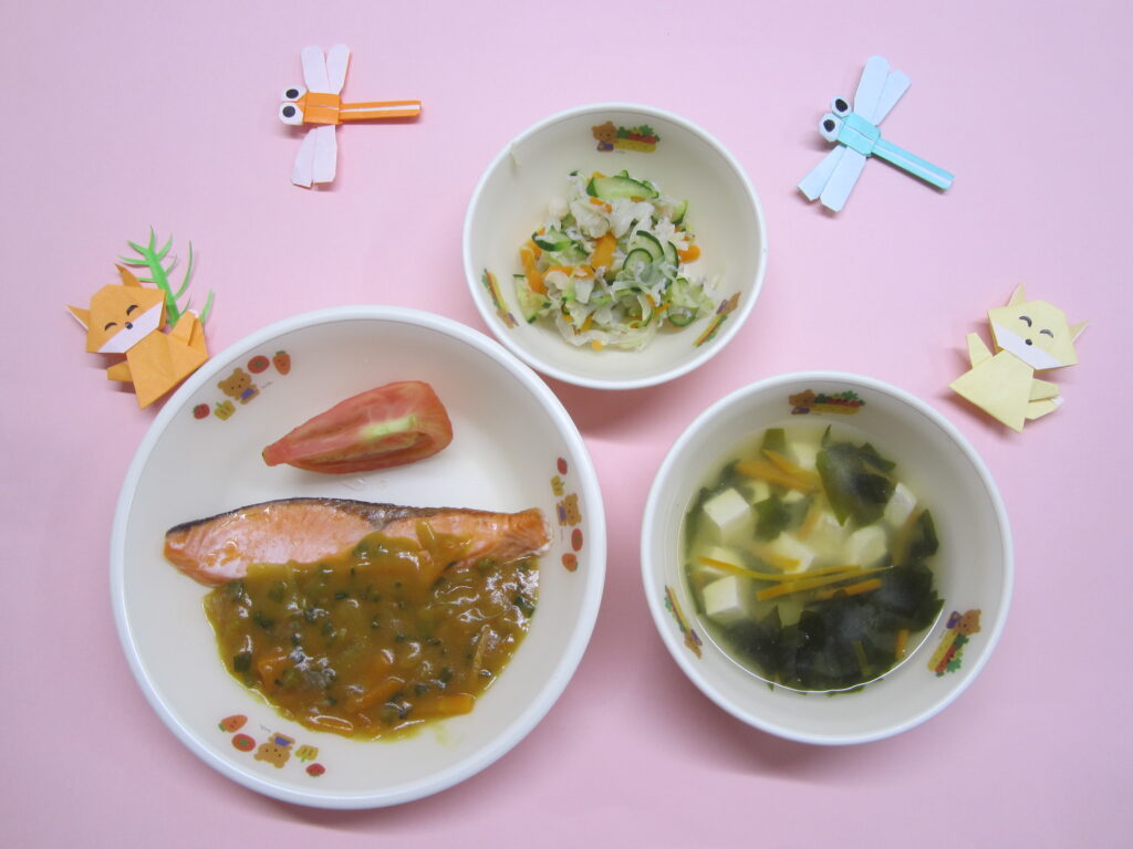 ・鮭と野菜のスープ煮・しらすと野菜の煮物・みそ汁(豆腐・人参)