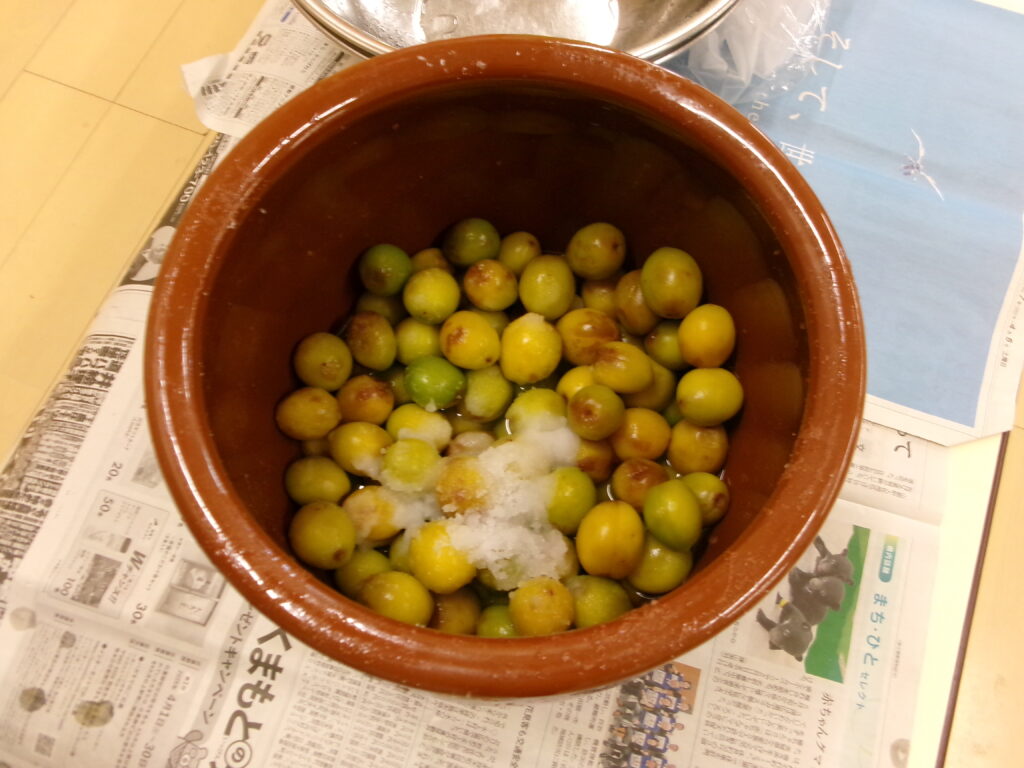 梅に塩をまぶしゴロゴロ揉んで漬けます。