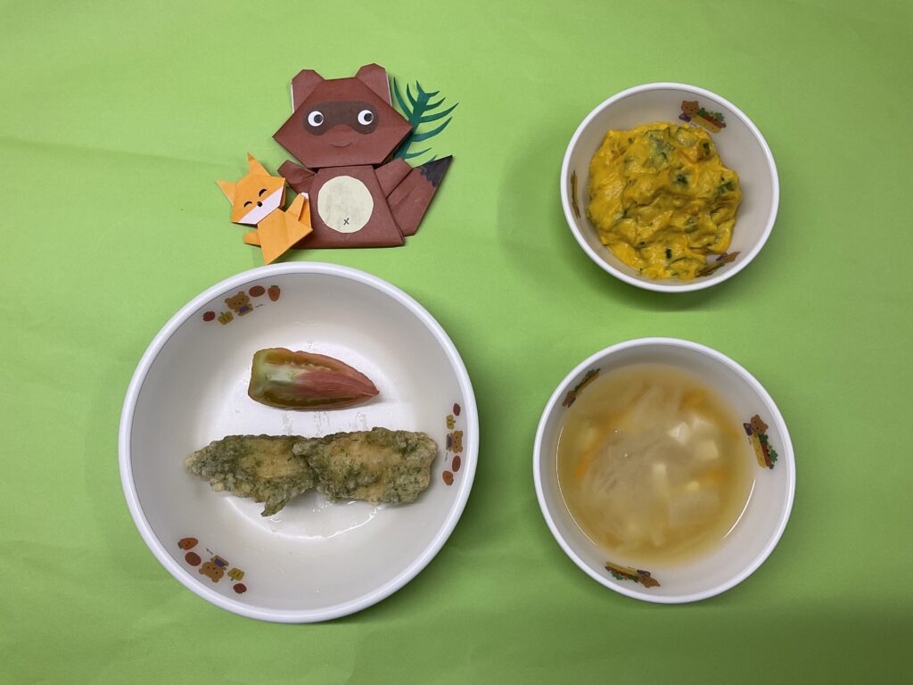 •魚の磯辺揚げ•南瓜サラダ•みそ汁(豆腐•玉ねぎ•人参)