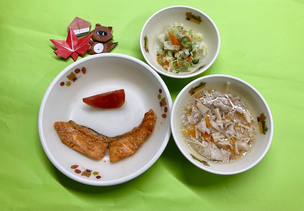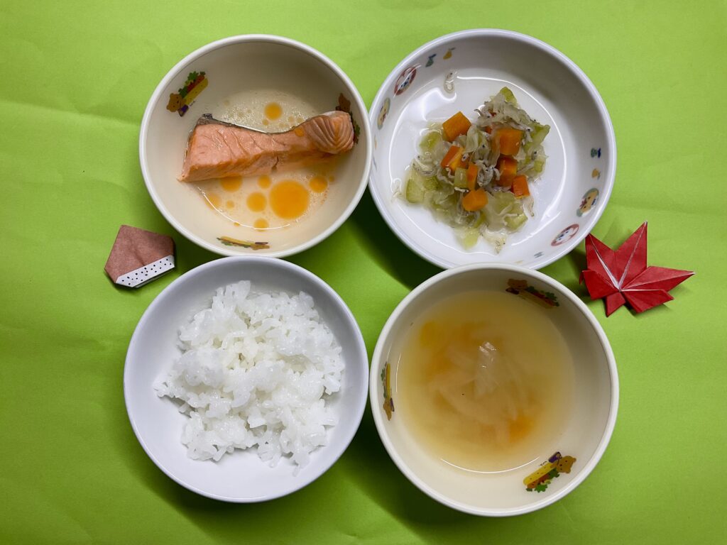 •魚のスープ煮•じゃこと野菜の煮物•みそ汁(人参•玉ねぎ)