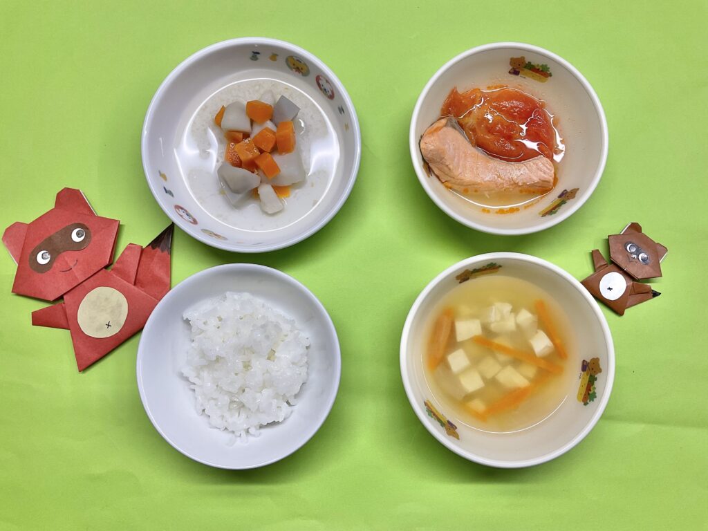 •鮭のトマト煮•里芋の煮物•みそ汁(豆腐•玉ねぎ•人参)