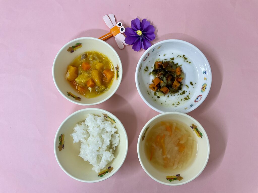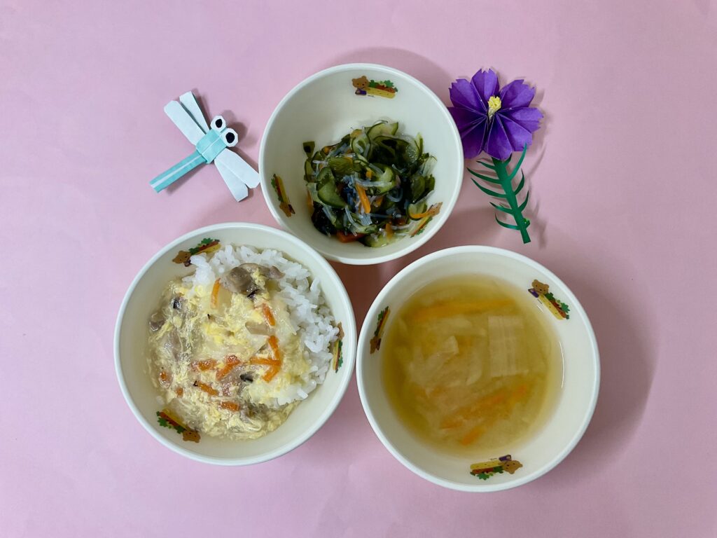 •鶏と野菜の煮物•胡瓜と若布の煮物•みそ汁(大根•人参)