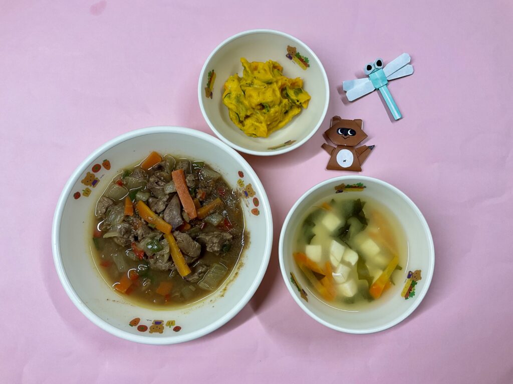 •鶏レバーカレー煮•南瓜サラダ・みそ汁(豆腐•人参•若布)