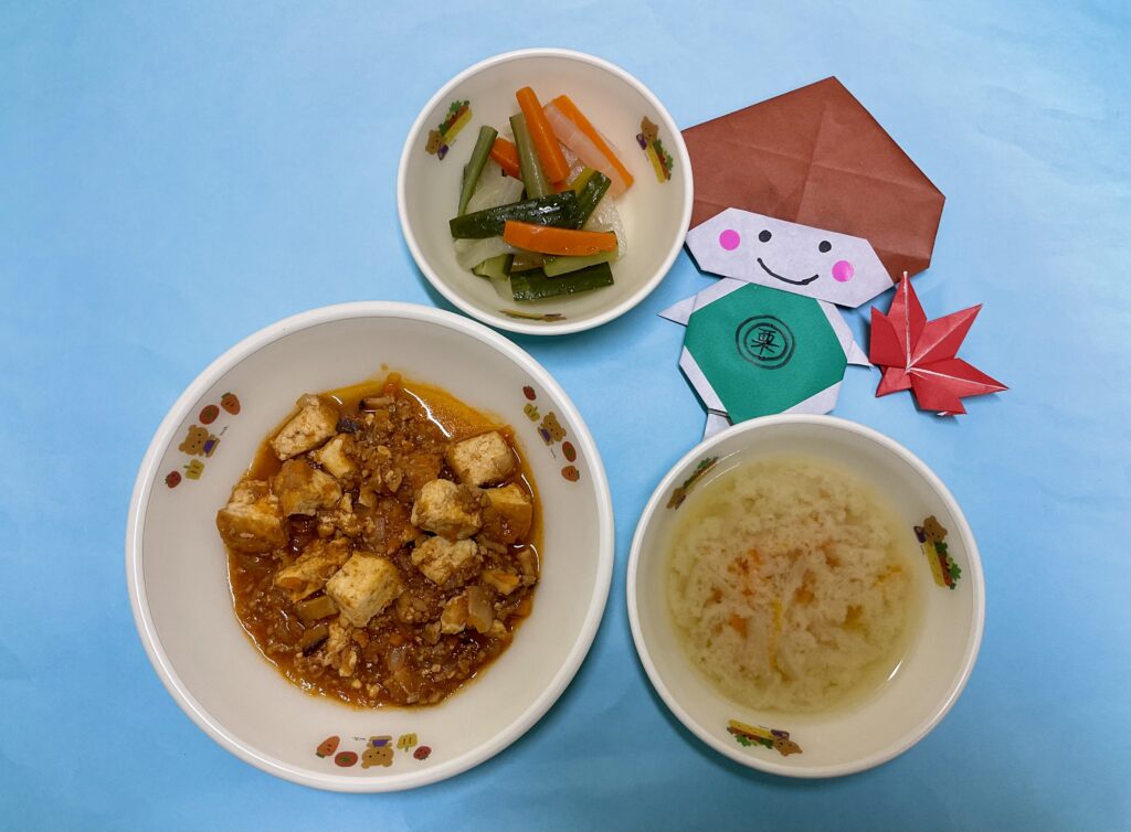 ・豚肉と豆腐の煮物・根菜の煮物・みそ汁(玉ねぎ・人参)