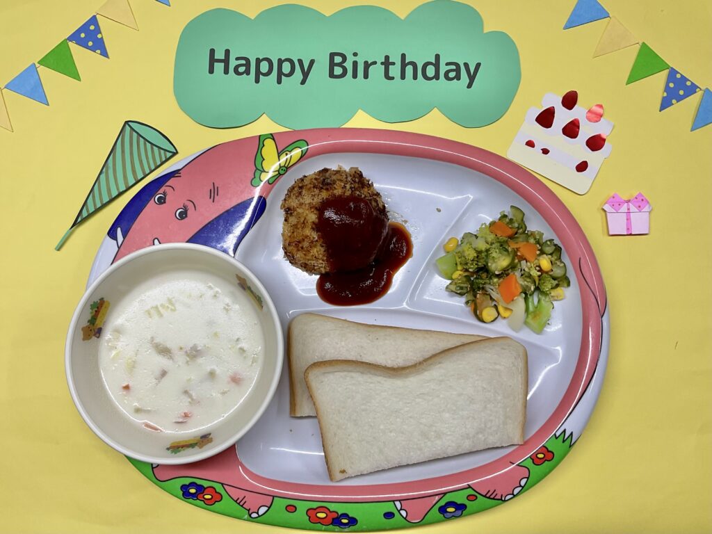 •パン・メンチカツ•ブロッコリーサラダ•クリームスープ(鶏肉•玉ねぎ•人参•白菜)