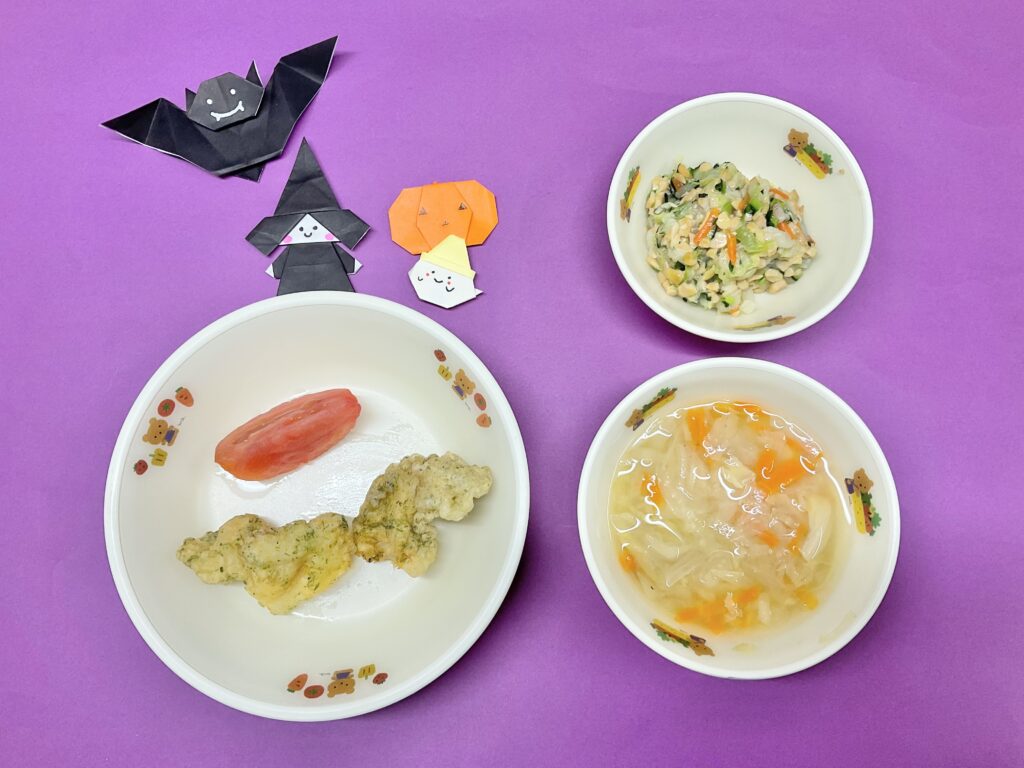 ・カレイのトマト煮・野菜納豆・みそ汁(玉ねぎ・人参・白菜)・バナナ