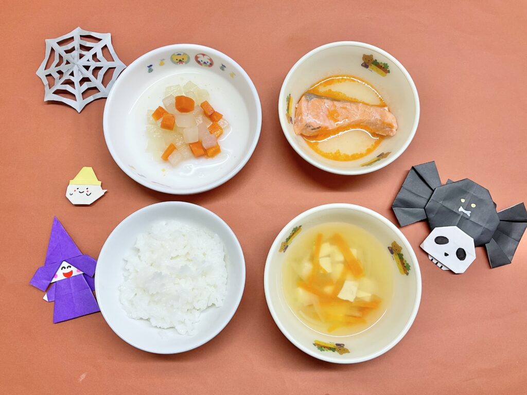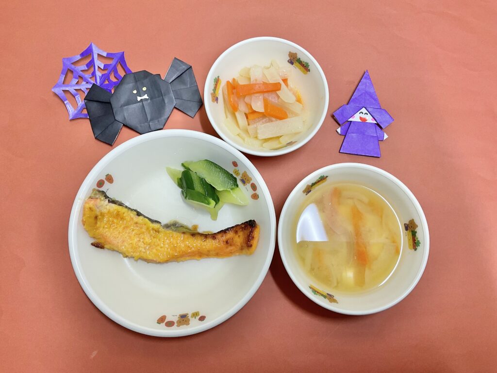 ・鮭のスープ煮・大根金平・みそ汁(豆腐・玉ねぎ・人参)