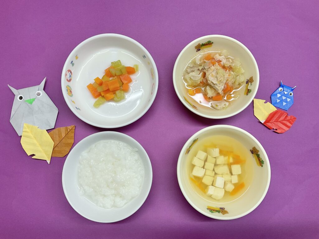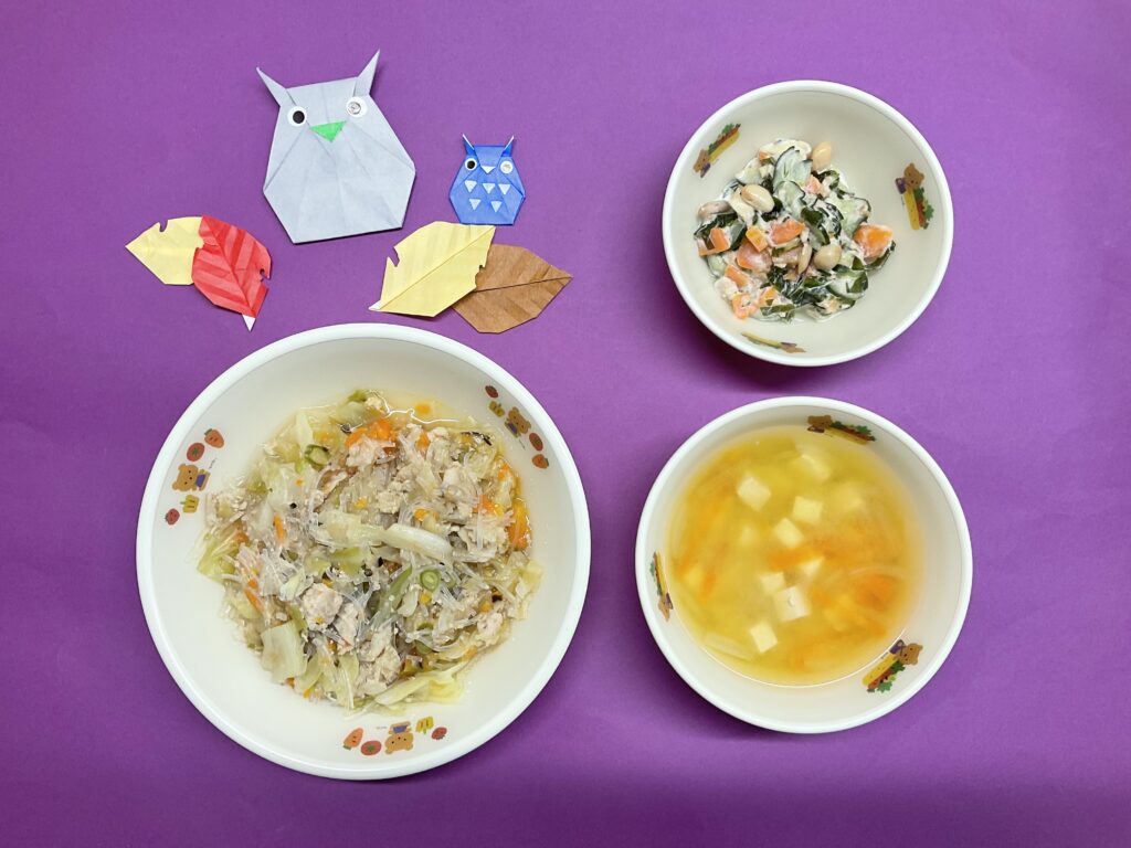 •豚肉とキャベツの煮物•野菜の煮物•みそ汁(豆腐•玉ねぎ•人参)