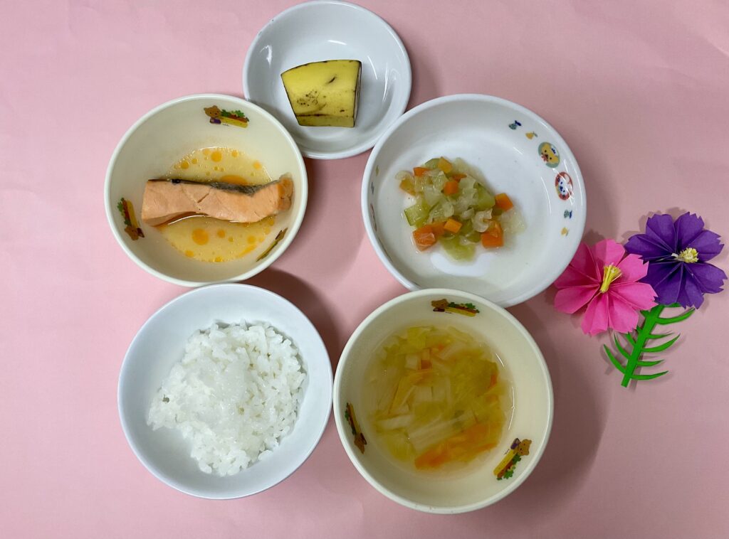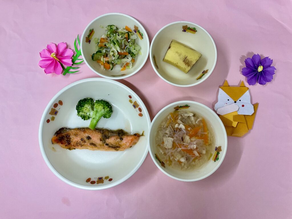 •鮭のみそ煮•野菜のおかか煮(人参•胡瓜•キャベツ)•すまし汁(白菜•玉ねぎ•人参)•バナナ