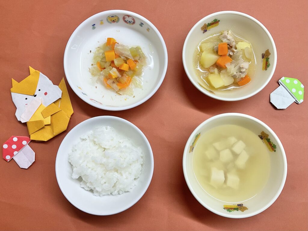 ・うま煮・野菜のおかか煮・みそ汁(豆腐・玉ねぎ)