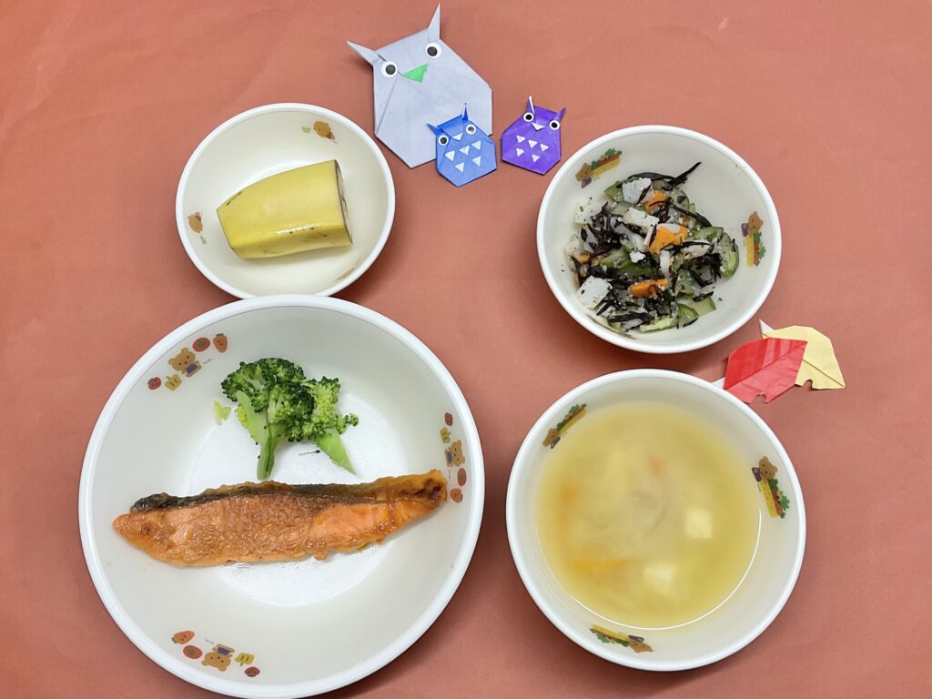 ・鮭とブロッコリーの煮物・カブとひじきの煮物・みそ汁(豆腐・玉ねぎ・人参)・バナナ