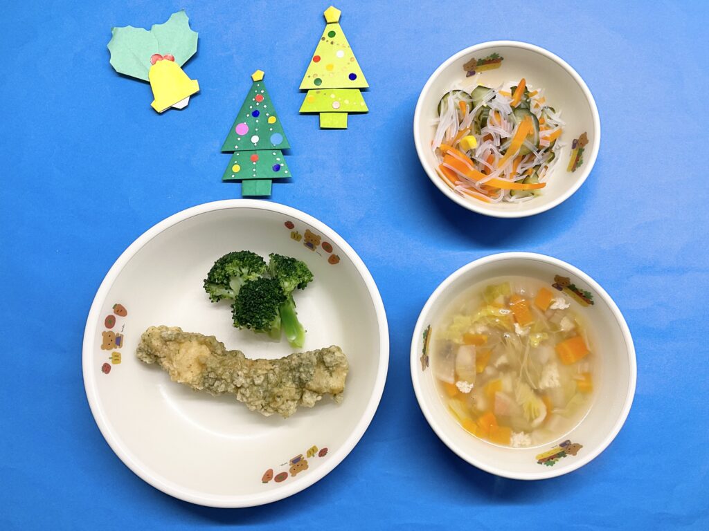 ・魚の磯辺揚げ・春雨サラダ・だご汁(鶏肉・人参・大根・白菜・油揚げ・干しシイタケ)
