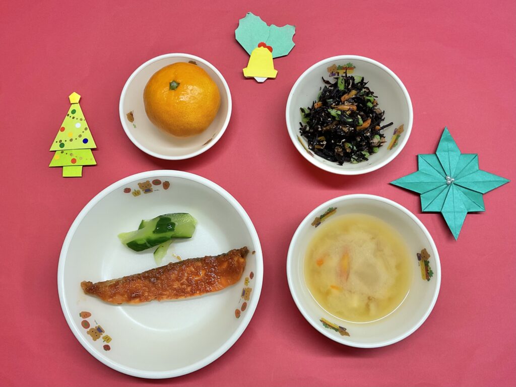 ・魚のケチャップ焼き・ひじき炒め煮・みそ汁(豆腐・玉ねぎ・人参)・みかん