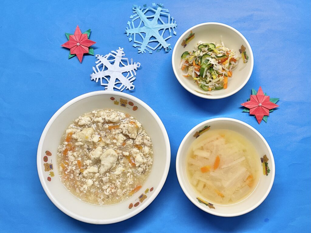 ・豆腐の柔らか煮・野菜のおかか煮・みそ汁(大根・人参)