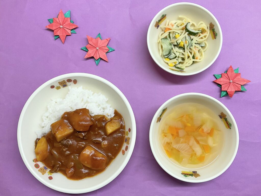 ・ハヤシシチュー・スパゲティサラダ・野菜スープ(キャベツ・人参・玉ねぎ)