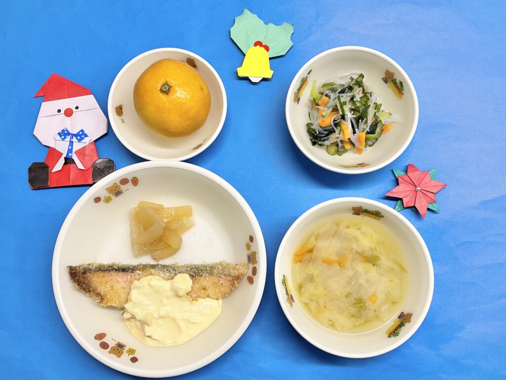 ・魚のタルタルソース・酢の物・みそ汁(白菜・人参・玉ねぎ)・みかん
