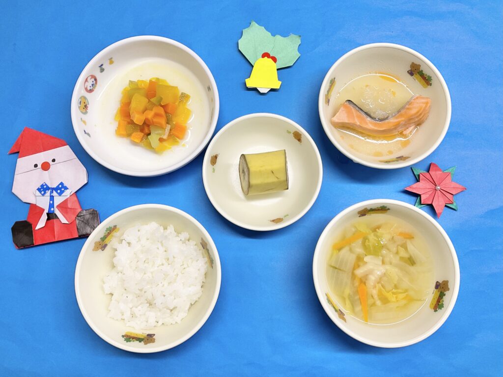 ・魚のスープ煮・南瓜と野菜の煮物・みそ汁(白菜・人参・玉ねぎ)•バナナ