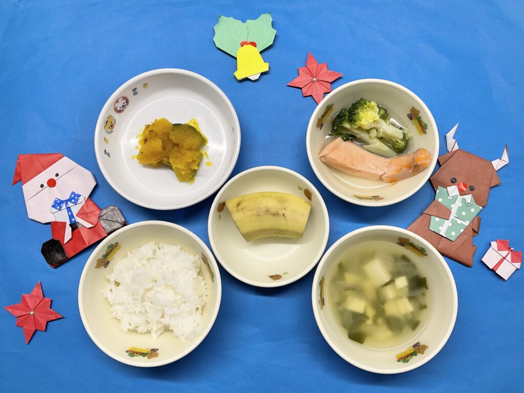 ・魚とブロッコリーのスープ煮・野菜のおかか煮・みそ汁(豆腐・玉ねぎ・若布)•バナナ
