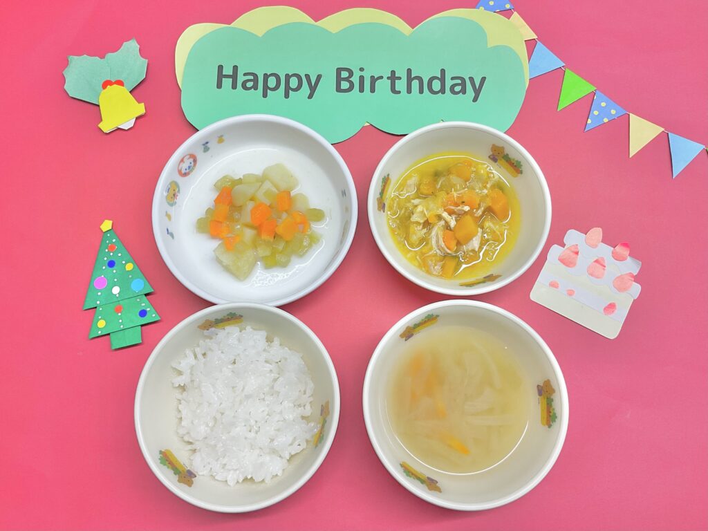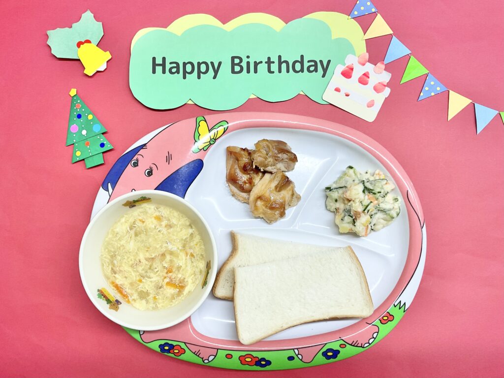 ・パン・照り焼きチキン・ポテトサラダ・コンソメ卵スープ(玉ねぎ・人参・卵)