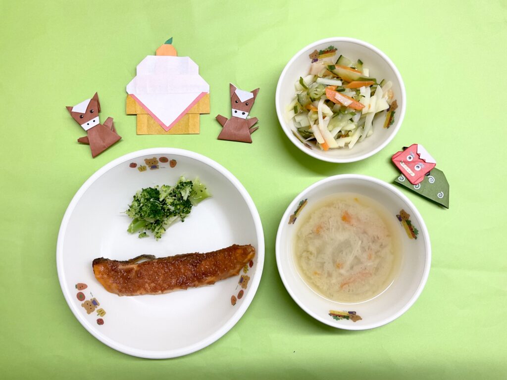・魚のケチャップ焼き・シャキシャキサラダ・みそ汁(玉ねぎ・人参・えのき)