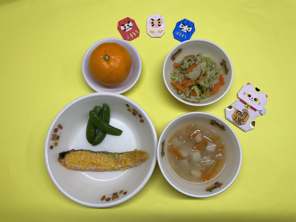 ・魚のチーズ焼き・じゃこ和え・みそ汁(玉ねぎ・人参・里芋)・みかん
