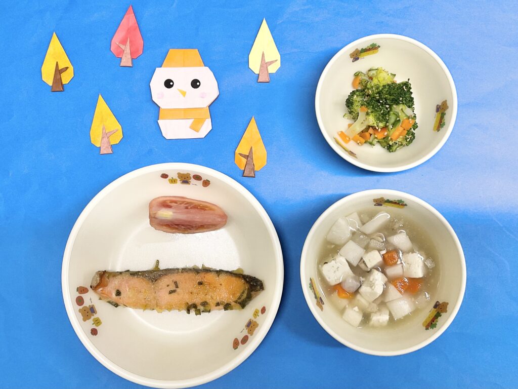 ・魚のちゃんちゃん焼き・ブロッコリーサラダ・のっぺ汁(鶏肉・人参・大根・里芋・干ししいたけ・ごぼう・焼き豆腐)