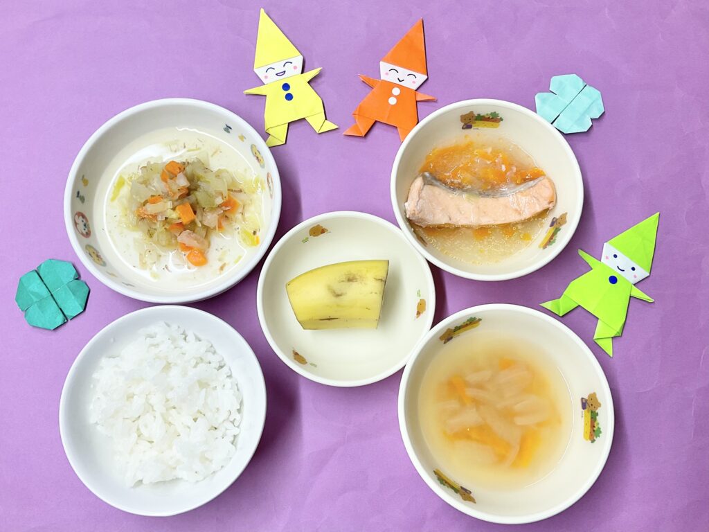 ・鮭のスープ煮・キャベツのおかか煮・みそ汁(人参・玉ねぎ)・バナナ