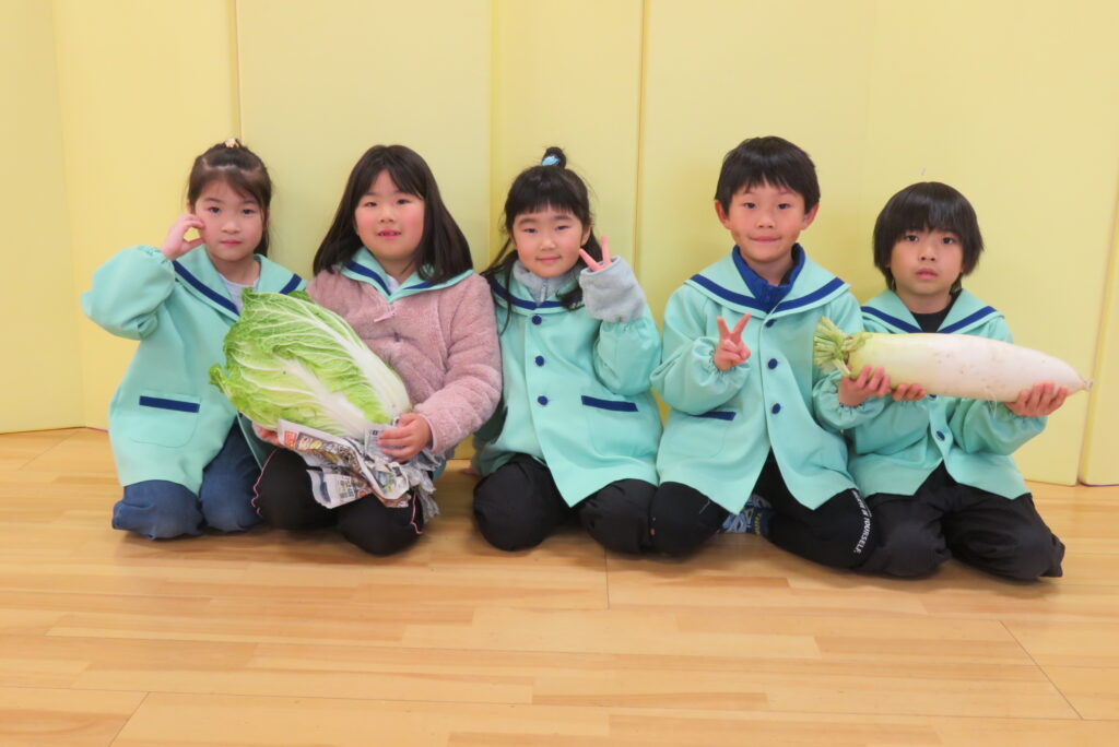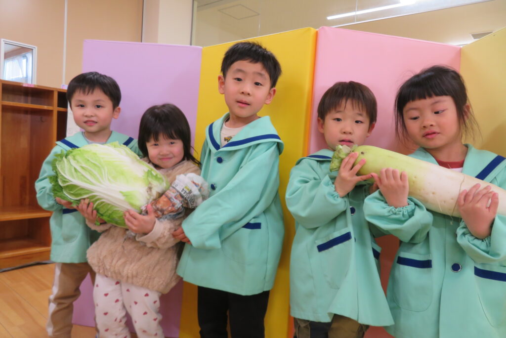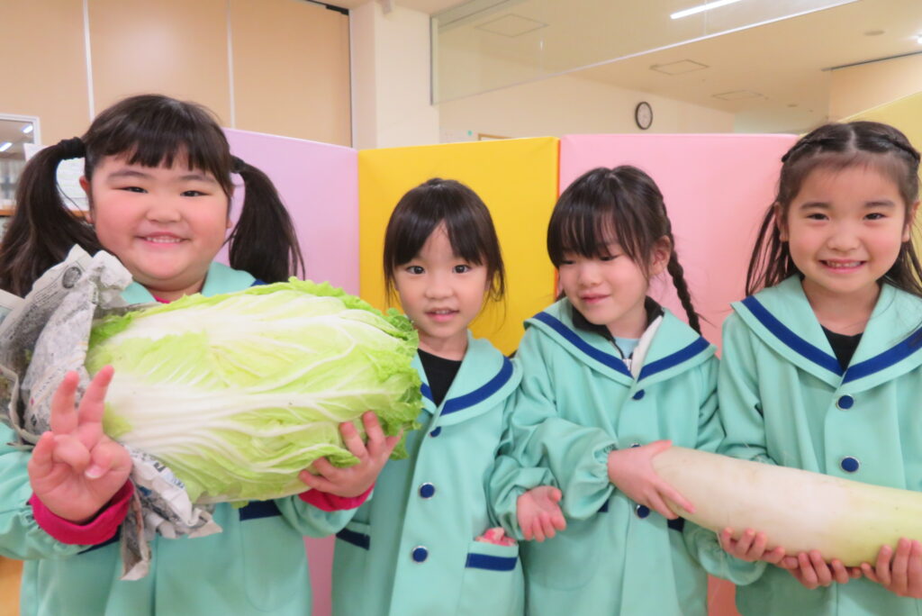 合志市にお住いの園田様より、白菜と大根をたくさん頂きました😊白菜は本日の「白菜サラダ」に大根は来週の「ピクルス」や「みそ汁」に入る予定です!一つ4キロ以上もある大きなものもあり、子どもたちもからも歓声があがっていました✨とっても甘くて美味しかったです😋💕