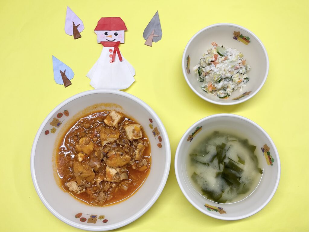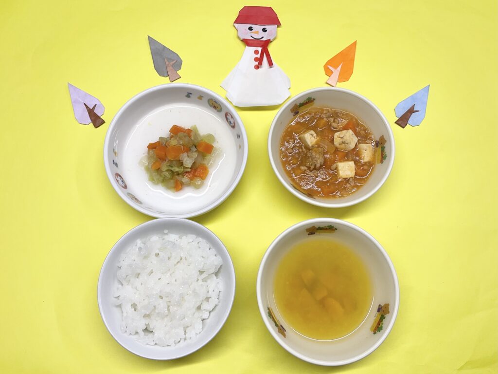 ・豆腐のミートソース・野菜の煮物・みそ汁(南瓜)