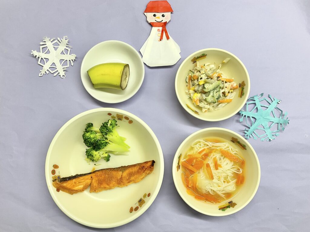 ・魚のブロッコリー煮・野菜のおかか煮・みそ汁(そうめん・人参)