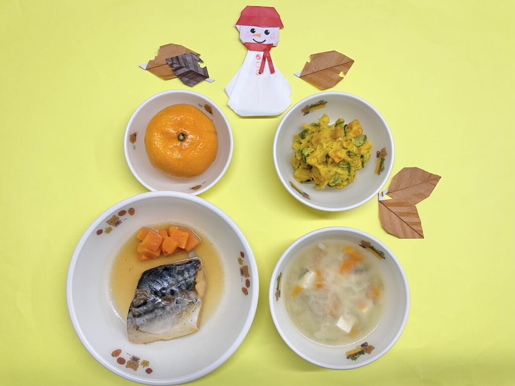 ・煮魚・南瓜サラダ・豚汁(豚肉・焼き豆腐・人参・ごぼう・大根)・みかん