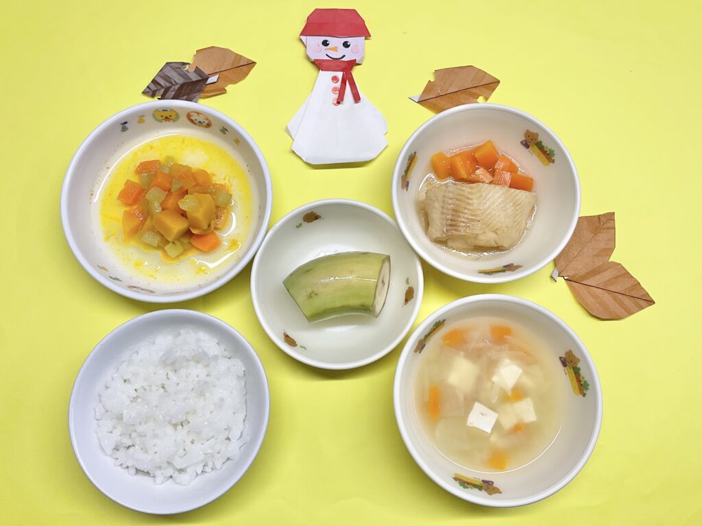 ・煮魚・南瓜の煮物・みそ汁(豆腐・大根・人参)•バナナ