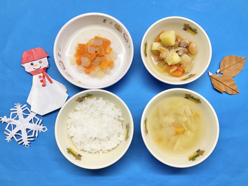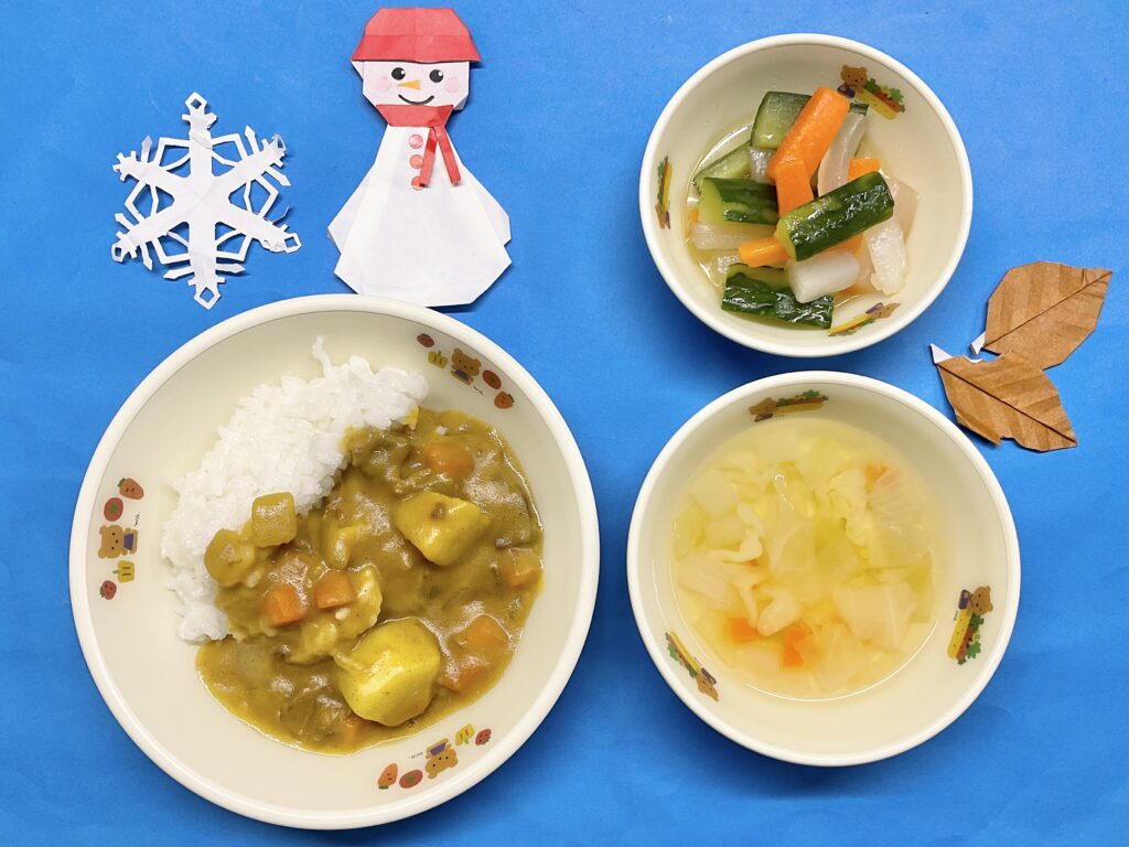 ・カレーシチュー・ピクルス・野菜スープ(キャベツ・人参・玉ねぎ)