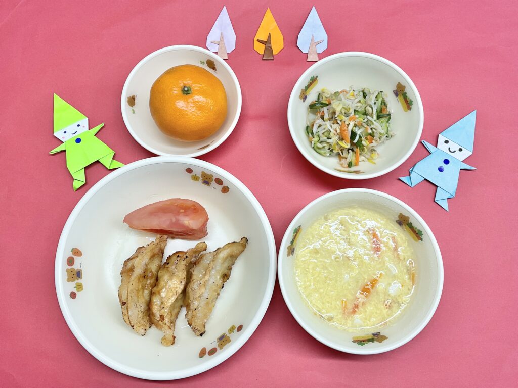 •揚げ餃子•ナムル•かきたま汁(玉ねぎ•人参•豆腐•卵)•みかん