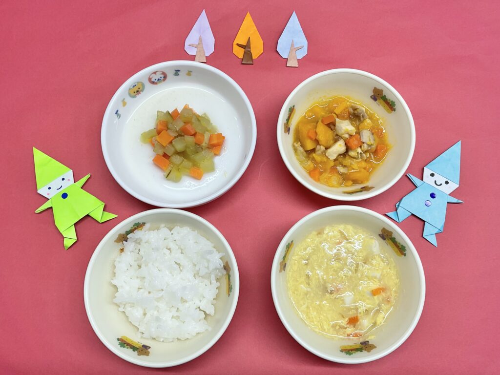•鶏と南瓜の煮物•野菜の煮物•かきたま汁(豆腐•玉ねぎ•人参•卵)