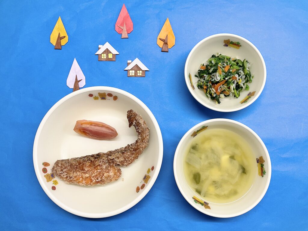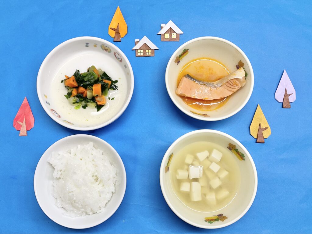 •鮭のトマト煮•野菜の煮物•みそ汁(豆腐•玉ねぎ)