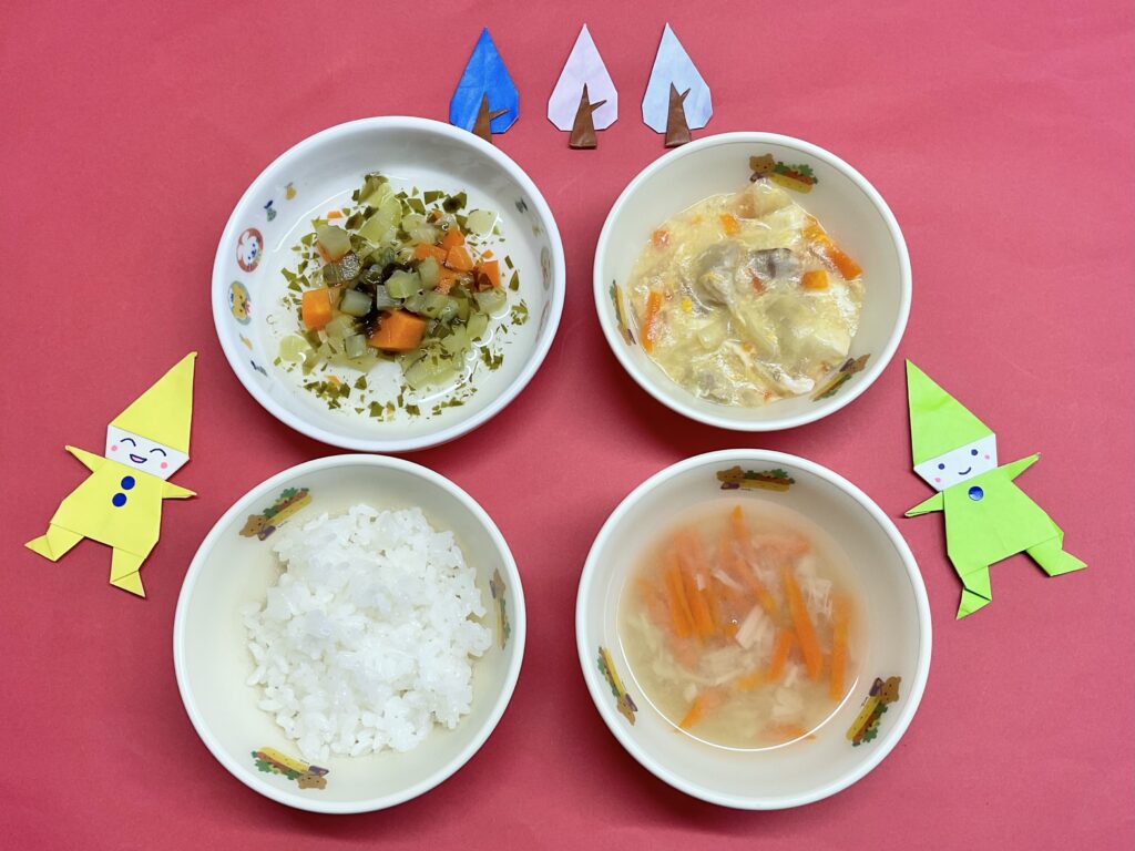 ・鶏と豆腐の親子丼・若布と胡瓜の煮物・みそ汁(えのき・人参)