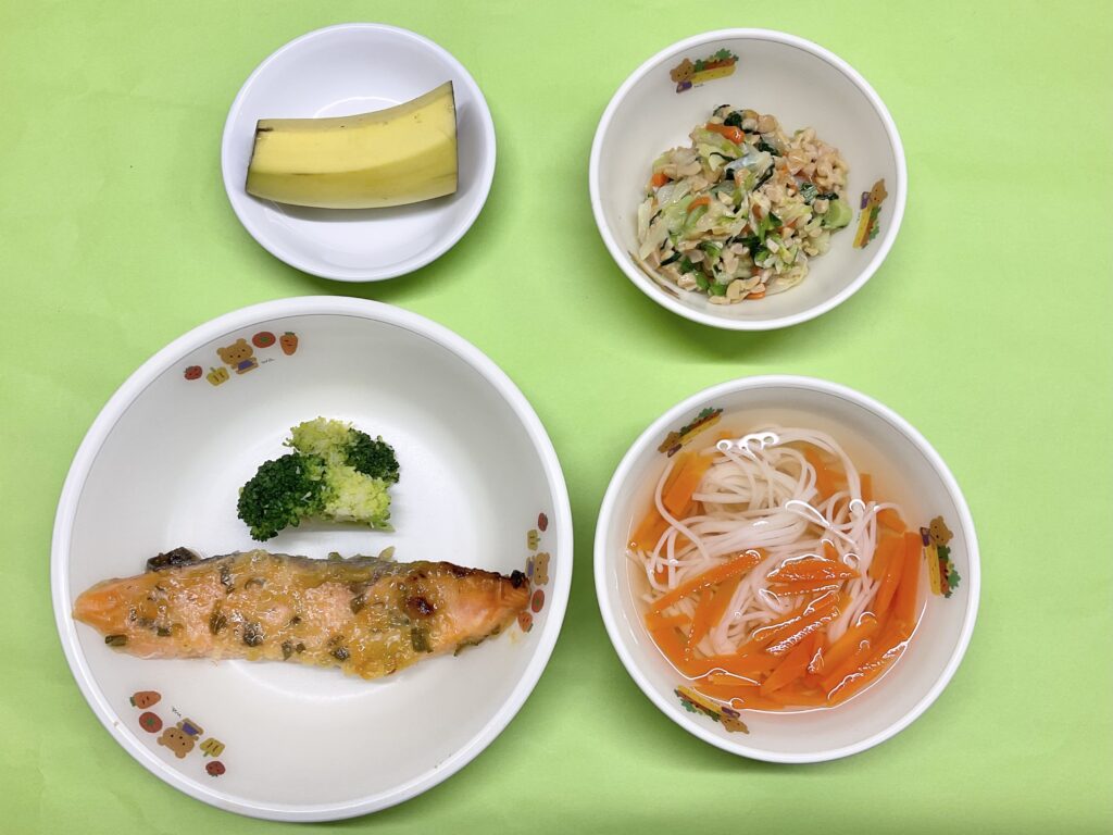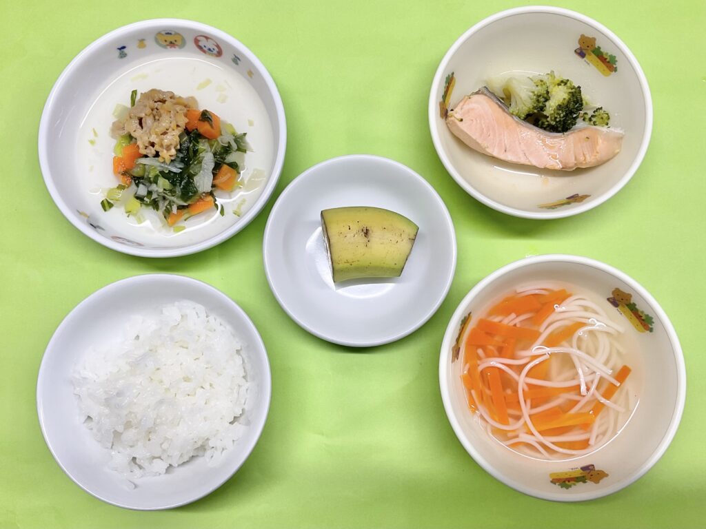 •魚のちゃんちゃん焼き•納豆和え•すまし汁(そうめん•人参)•バナナ