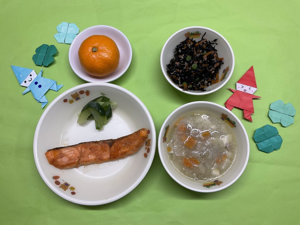 •魚のタンドリー•ひじき炒め煮•豚汁(豚肉•大根•人参•里芋・豆腐•ごぼう•玉ねぎ)•みかん