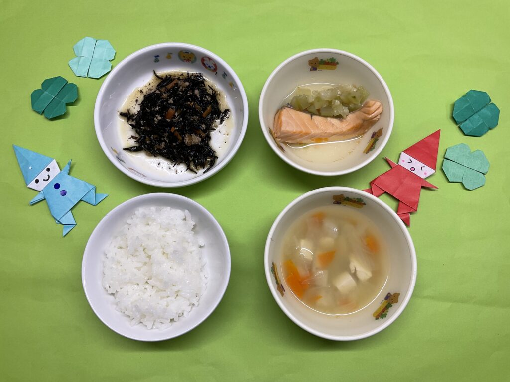 •魚のスープ•ひじき炒め煮•みそ汁(大根•人参•豆腐•里芋)