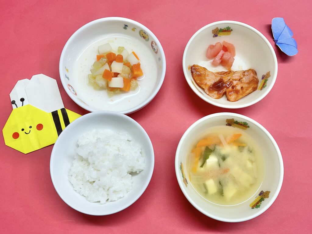 ・魚のケチャップ焼き・じゃが芋の煮物・みそ汁(豆腐・玉ねぎ・人参・若布)