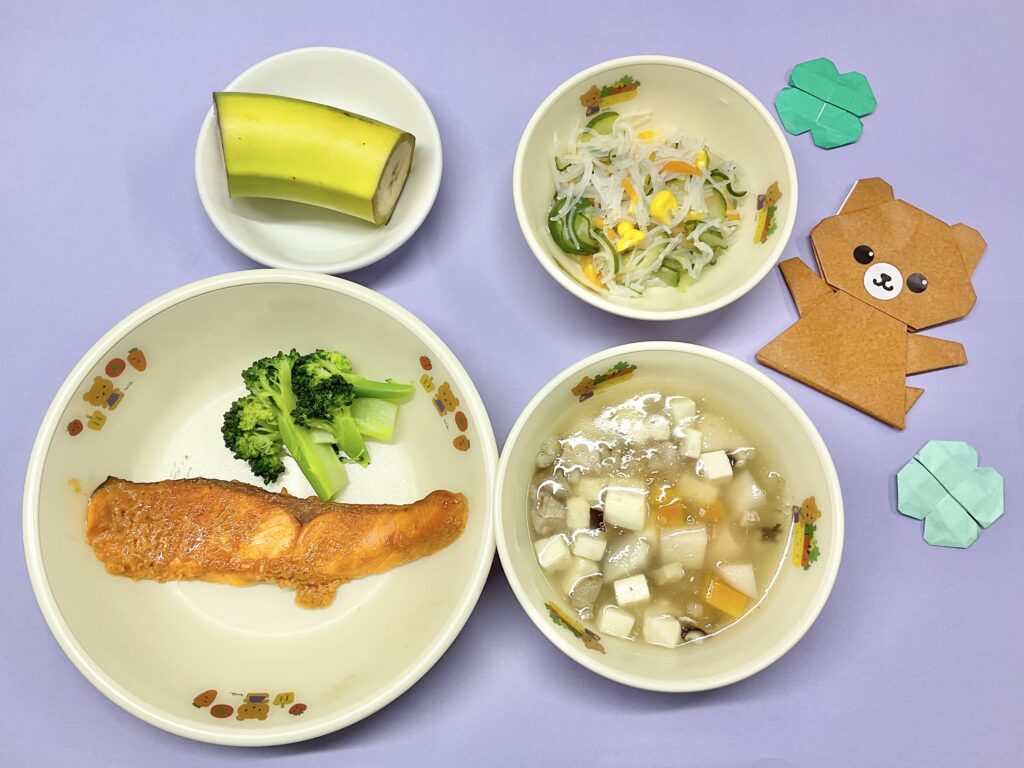 •魚のタンドリー•春雨サラダ•のっぺ汁(鶏肉•大根•人参•里芋・ごぼう•豆腐•干し椎茸)•バナナ