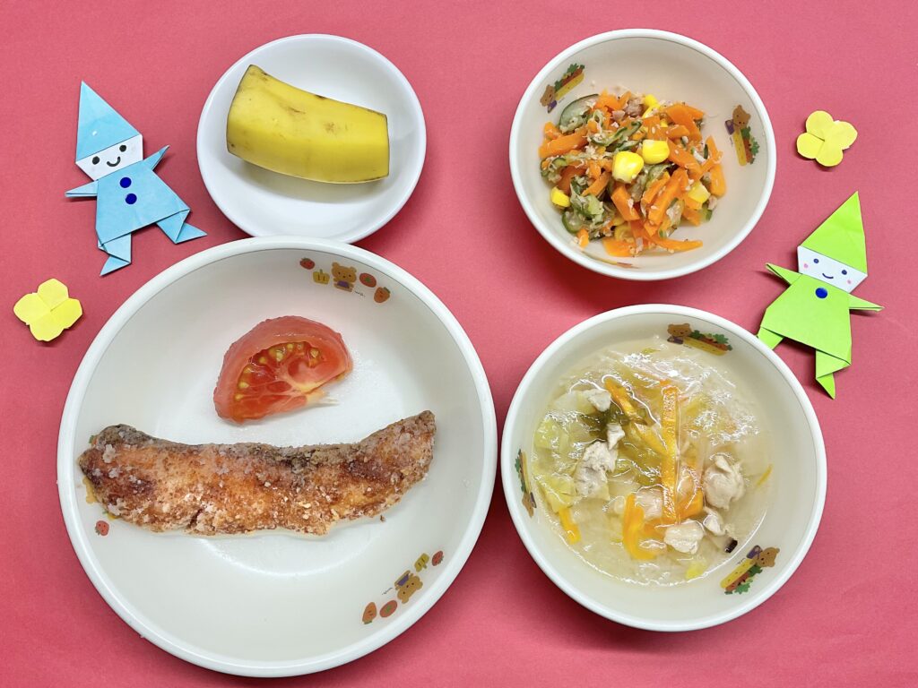 ・魚の竜田揚げ・人参サラダ・タイピーエン(豚肉・人参・玉ねぎ・白菜・干し椎茸・春雨)・バナナ