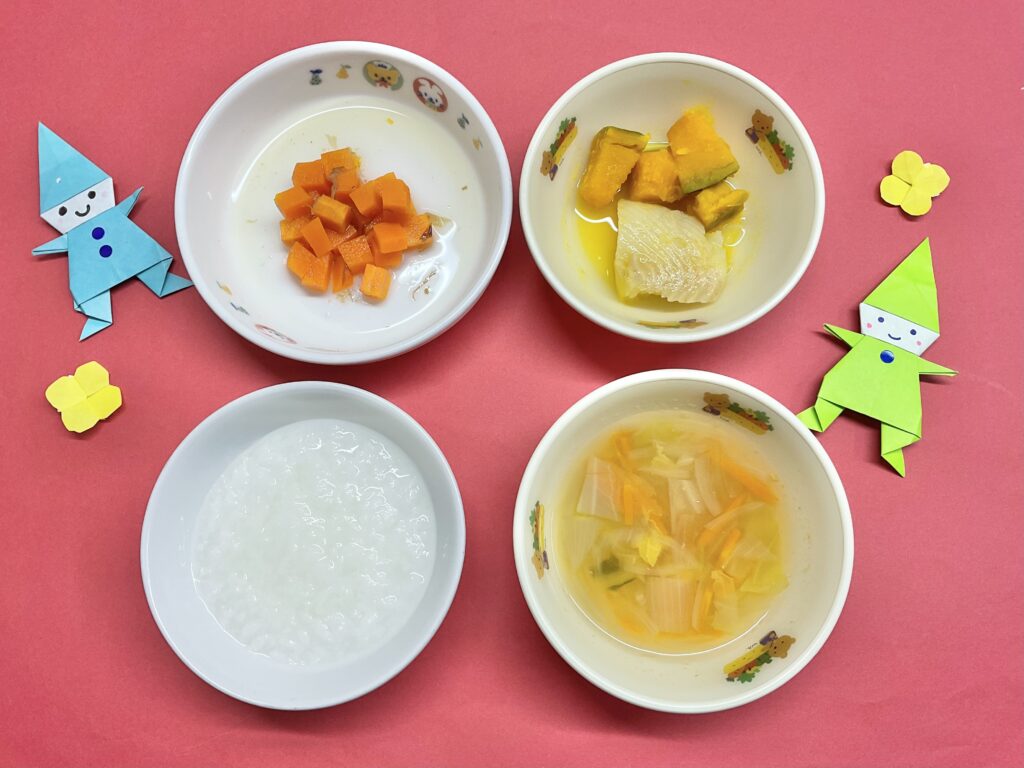 ・魚と南瓜の煮物・野菜のおかか煮・みそ汁(玉ねぎ・人参・白菜)