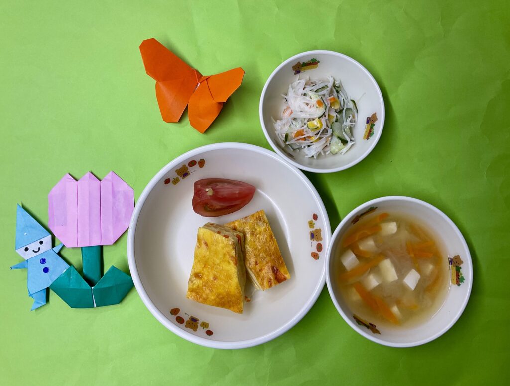 ・スパニッシュオムレツ・ビーフンサラダ・みそ汁(玉ねぎ・人参・豆腐)