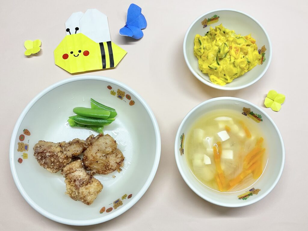 ・からあげ・南瓜サラダ・みそ汁(豆腐・玉ねぎ・人参)