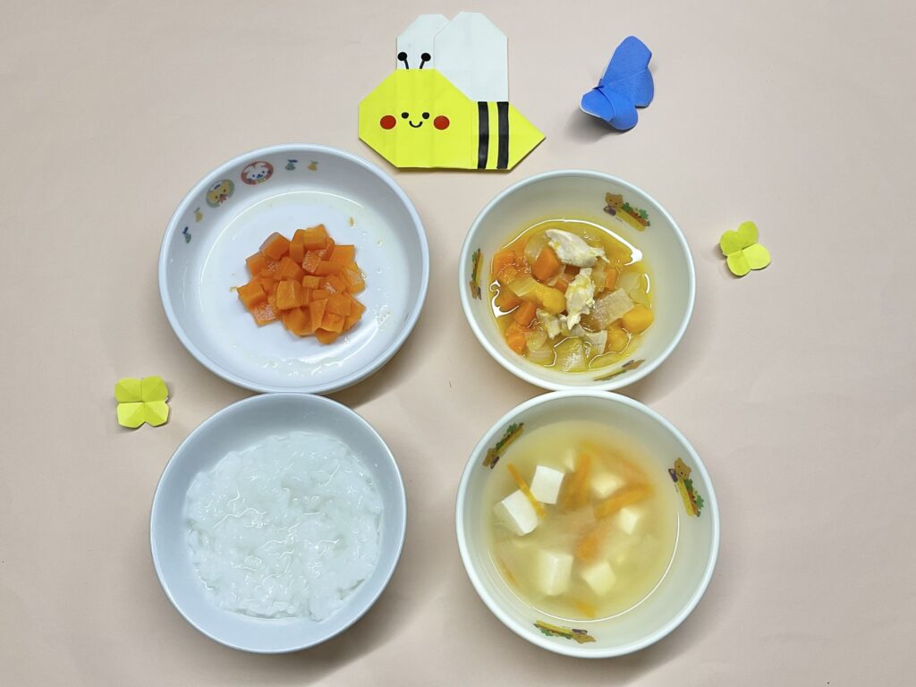 ・鶏と南瓜の煮物・人参の煮物・みそ汁(豆腐・玉ねぎ・人参)