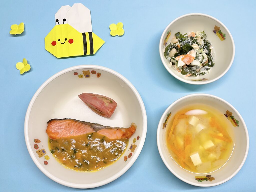 •魚のスープ煮•野菜と若布の煮物•みそ汁(豆腐•玉ねぎ•人参)