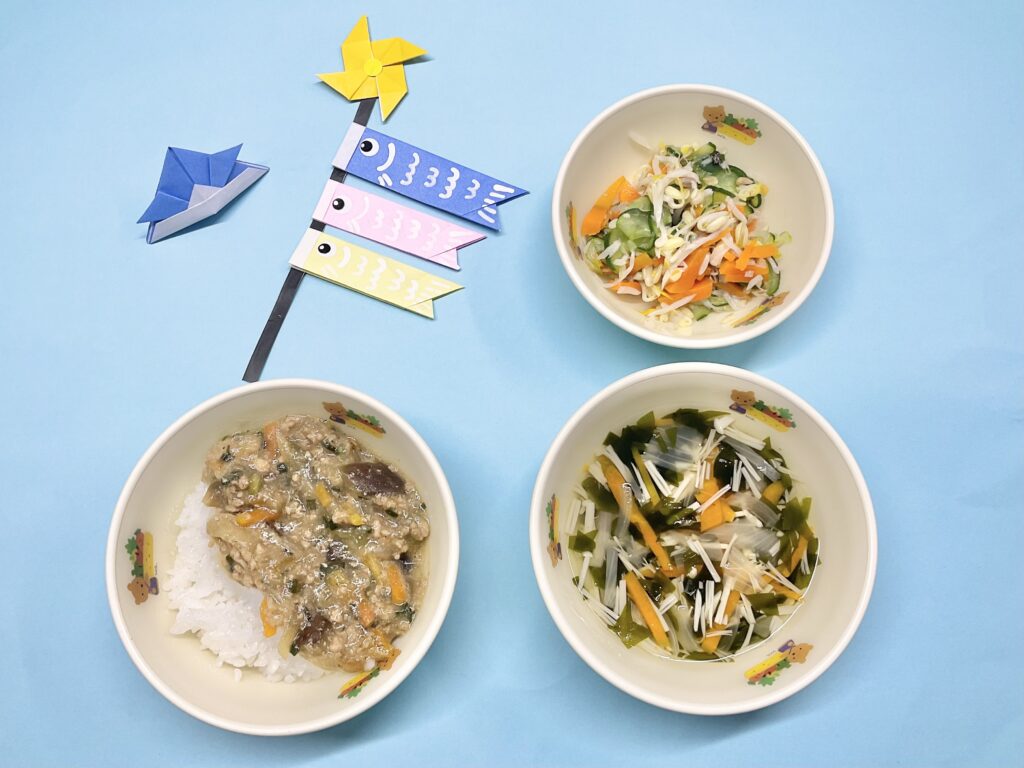 •麻婆茄子丼•ナムル•若布スープ(玉ねぎ•人参•若布•えのき)